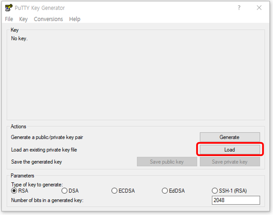 2. Puttygen.exeμ μ€νν©λλ€. μ€ν ν Loadλ₯Ό ν΄λ¦νκ³ , νμΌ νμ₯μλ₯Ό λͺ¨λ 보기 ν ν, VM μμ± μ λ°μ μ μ©ν€λ₯Ό λΆλ¬μ΅λλ€.