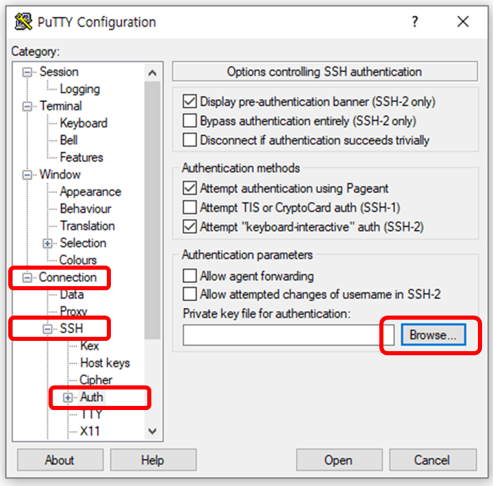5. μ΄μ μμ μ€μΉν putty.exeλ₯Ό μ€νν©λλ€. Categoryμμ SSH-Authλ₯Ό μ°Ύμ λ€μ΄κ°λλ€.