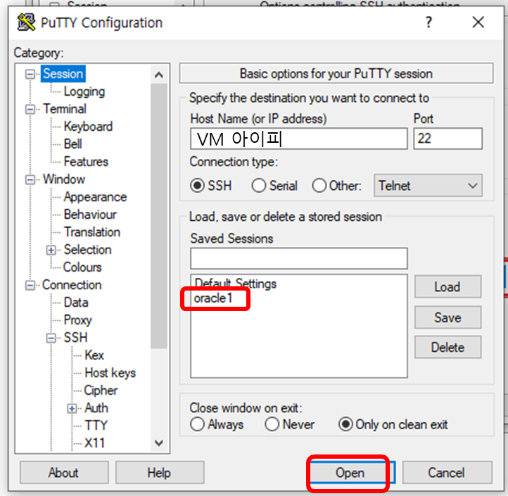6. λ€μ Categoryμ SessionμΌλ‘ μ΄λν©λλ€. μμ±ν VM IPλ₯Ό μ λ ₯νκ³ , Session μ΄λ¦μ νλ λ§λ λ€ Openμ λλ¬ μ μν©λλ€. Session μ΄λ¦μ λλΈν΄λ¦ν΄λ λ©λλ€.