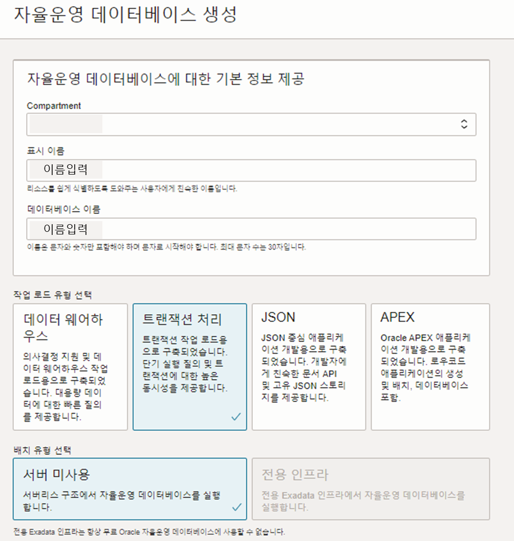 2. DB 구성(표시이름, 데이터베이스 이름, 작업로드 유형) 설정