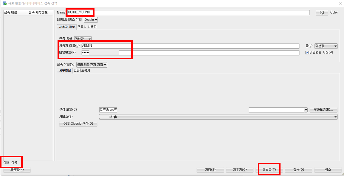 - 비밀번호: OCI DB 생성에 사용한 비밀번호