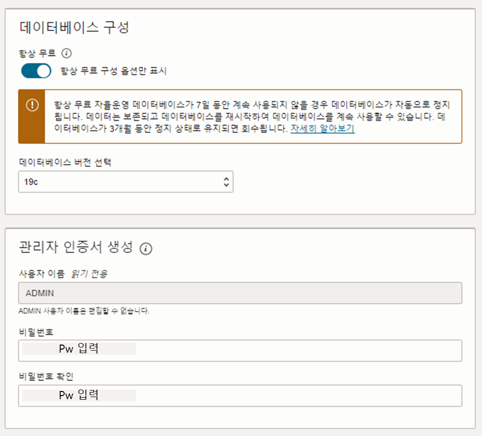 3. 오라클 DB 버전선택 (현시점에서 무료 티어는 19c만 가능했었습니다) 및 관리자 계정 설정