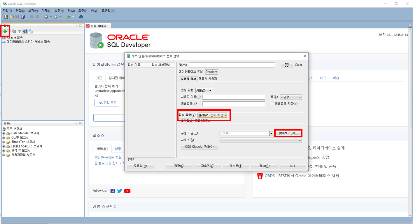 3. 데이터베이스 접속 클릭 - 접속 유형 '클라우드 전자 지갑' - 찾아보기 클릭